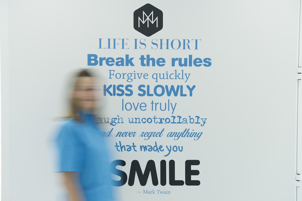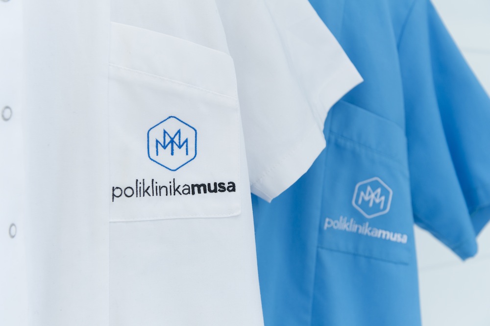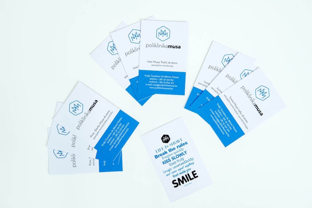 The branding of a clinic is a strategic task. An important prerequisite for its promotion is an unique, coherent and positive image. The basis therefore is a profesional corporate design. The goal of the new corporate design was to achieve three main goals: to provide the patients and staff the feel of comfort, to make them like visit the clinic and to make them recommend it to others. The visual identity needed to be distinctive and applicable in an unique way to various media (brochures, business card, website, signage). The idea of the visual identity of dental clinic Musa was developed in two directions. The first was to create a sign (in this case it is a simple monogram),that will put the clinic above the existing logos that we can everywhere see, and that every day, more and more resemble each other. The second direction was to determine a new and distinctive color that will show the ability to implement through the entire interior, signalization, and the printed materials. The inspiration for this monogram we found in one common photo (shown here), which shows who actually are the three letters "M". With a simple but elegant typography the monogram makes a harmonius and distinctive whole.