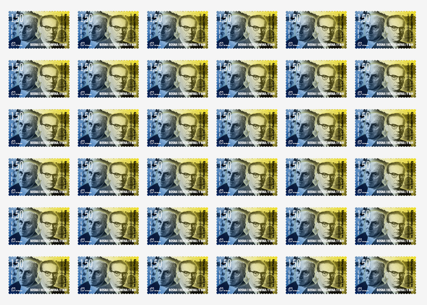 Croatian post Ltd. Mostar has issued, in honor of B&H Nobel Laureates, commemorative postage stamp (sheet 9 stamps), postmark and the first day cover.