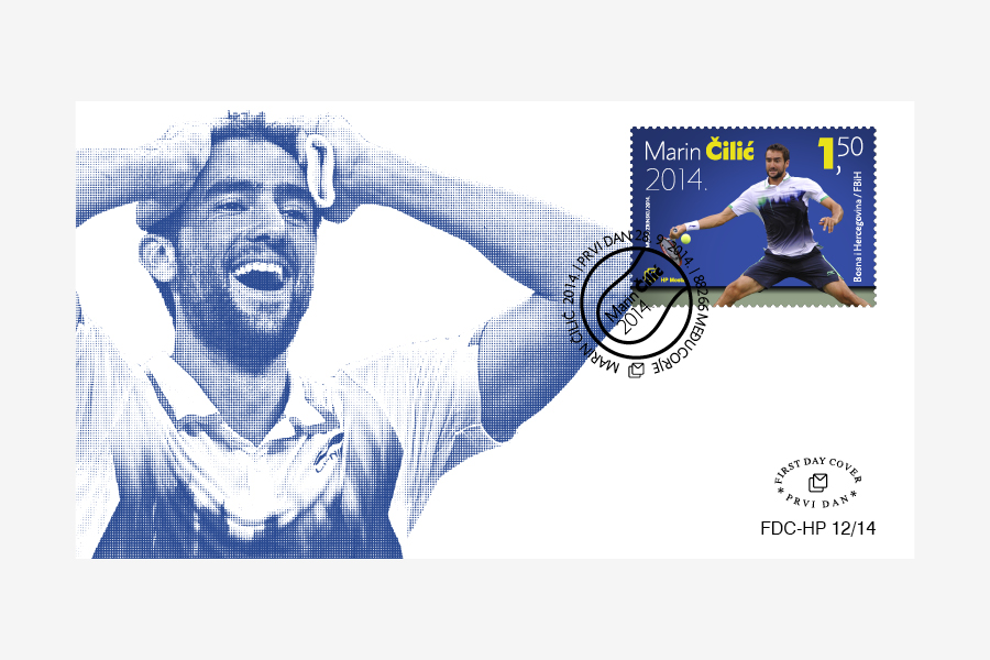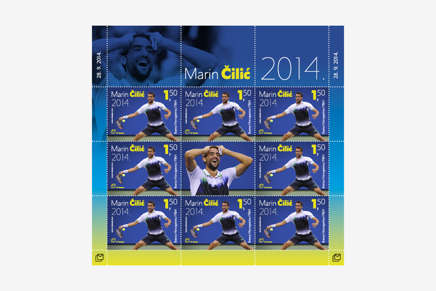 Hrvatska pošta d.o.o. Mostar izdala je prigodnu poštansku marku u arku od 8 maraka + vinjeta, žig i omotnicu prvoga dana (FDC). Ma koliko izgledalo jednostavno dizajnirati poštansku marku s ovim veličanstvenim sportašem, zbog autorskih prava organizatora svjetskih turnira bili smo uskraćeni za prikazivanje najvažnijih elemenata koji su pratili njegov nedavni uspjeh - osvajanje US Opena. Simuliranjem pozadine prepoznatljive za ovaj turnir, te dinamičnim ulaskom - utrčavanjem Marina Čilića u kadar - na vinjeti, dobiva se ugođaj kao da zapravo stojite upravo tu i gledate taj povijesni meč. Jednostavna tipografija s istaknutim prezimenom, te brojem na nominali poveznica su koja obilježava njegovo osvajanje turnira.
