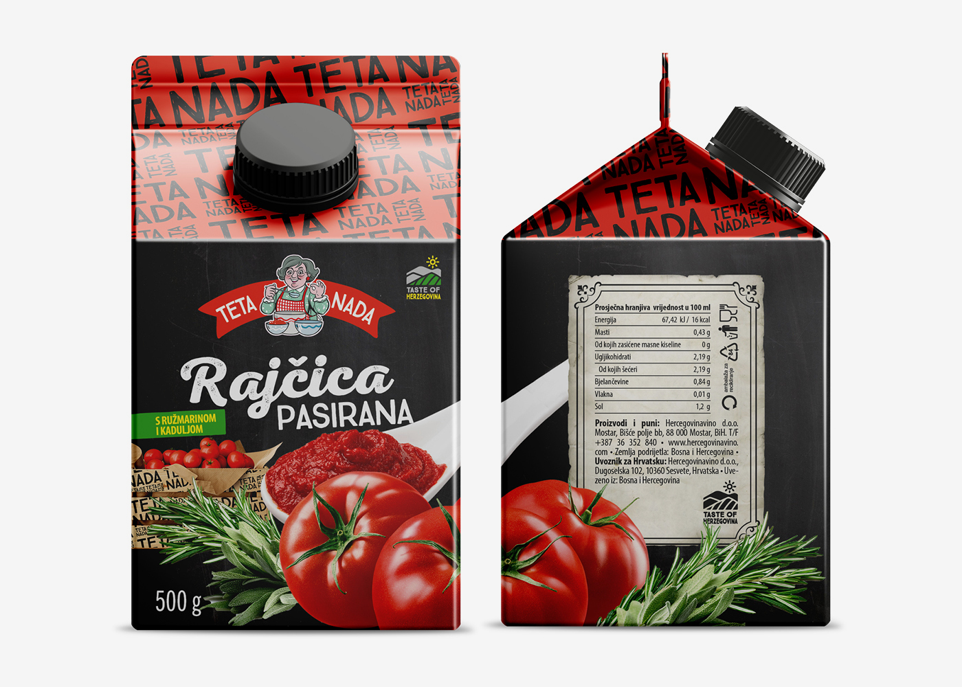 Tvrtka Hercegovinavino, koja je proizvođač pića sa sjedištem u Mostaru, obratila nam se za projekt dizajna vizualnog identiteta i ambalaže za novi asortiman prehrambenih proizvoda. Glavni ciljevi projekta bili su stvaranje jedinstvenog branda koji ističe kvalitetu proizvoda napravljenih prema tajnama tradicionalnog hercegovačkog recepta i stvaranje identiteta s unaprijed definiranim imenom - Teta Nada.