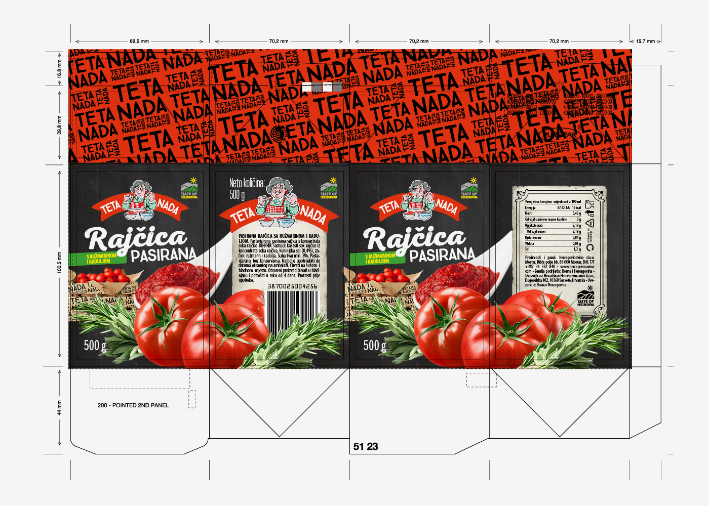 Klijent je uvođenjem novog branda želio oživjeti postojeći asortiman proizvoda, s naglaskom na prirodu i tradiciju. Inspirirani poslovnom filozofijom klijenta, dizajnirali smo brand s originalno osmišljenim likom u logotipu koji podržava i obogaćuje vjerodostojnost priče o Teti Nadi. Također, istovremeno smo željeli staviti naglasak i na privlačnost domaćeg proizvoda.
